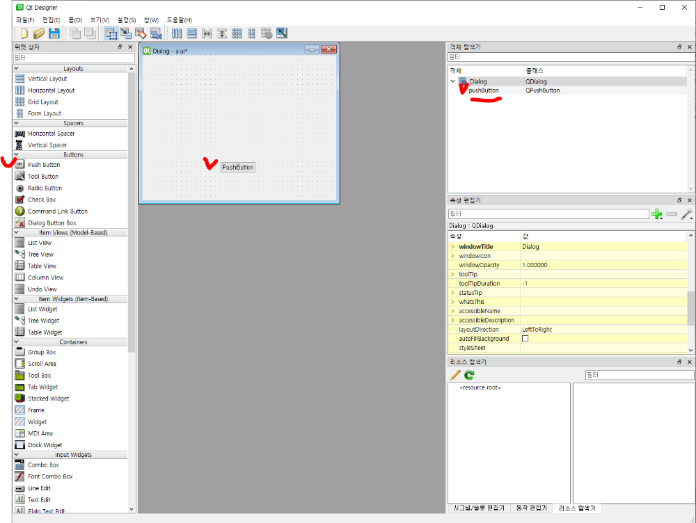 속성창에 pushButton 이름으로 객체가 생성된걸 확인할 수 있습니다.