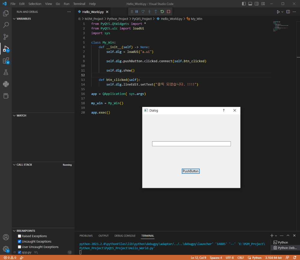 Push Button을 클릭하니 Line Edit의 Text값이 "클릭되었습니다.!!!"로 설정이 되었습니다.