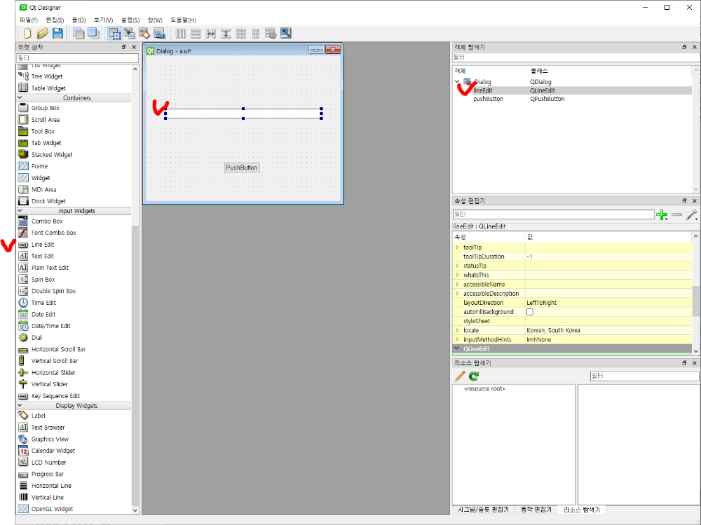 오른쪽 속성 창에는 lineEdit으로 객체가 생성되었습니다.