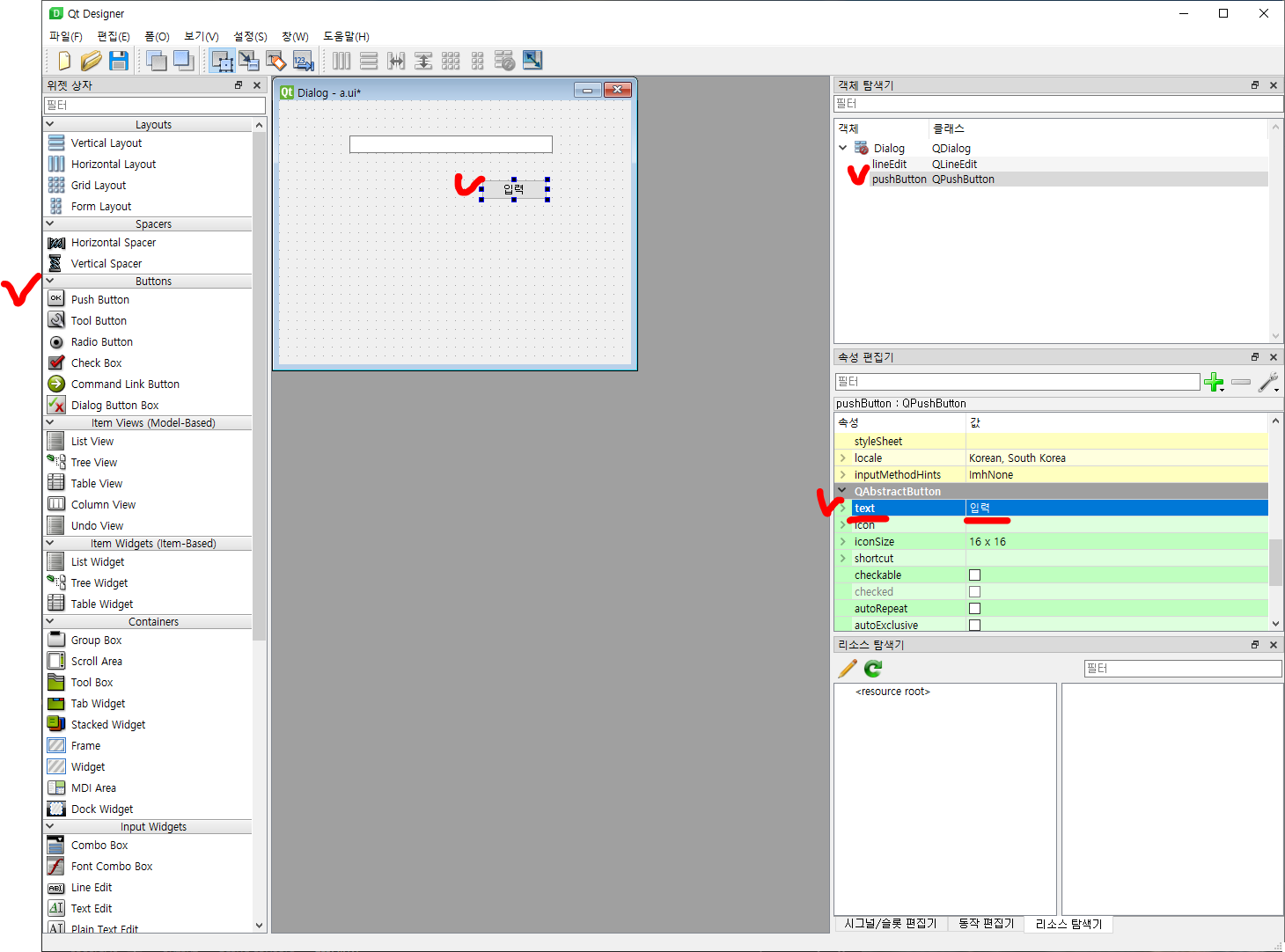 오른쪽 속성창에서 text 속성을 "입력"이라고 설정해 줄게요.