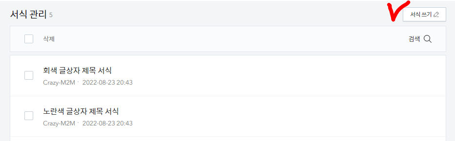 오른쪽 위에 "서식 쓰기"를 클릭해서 서식을 만들 볼게요. ^^