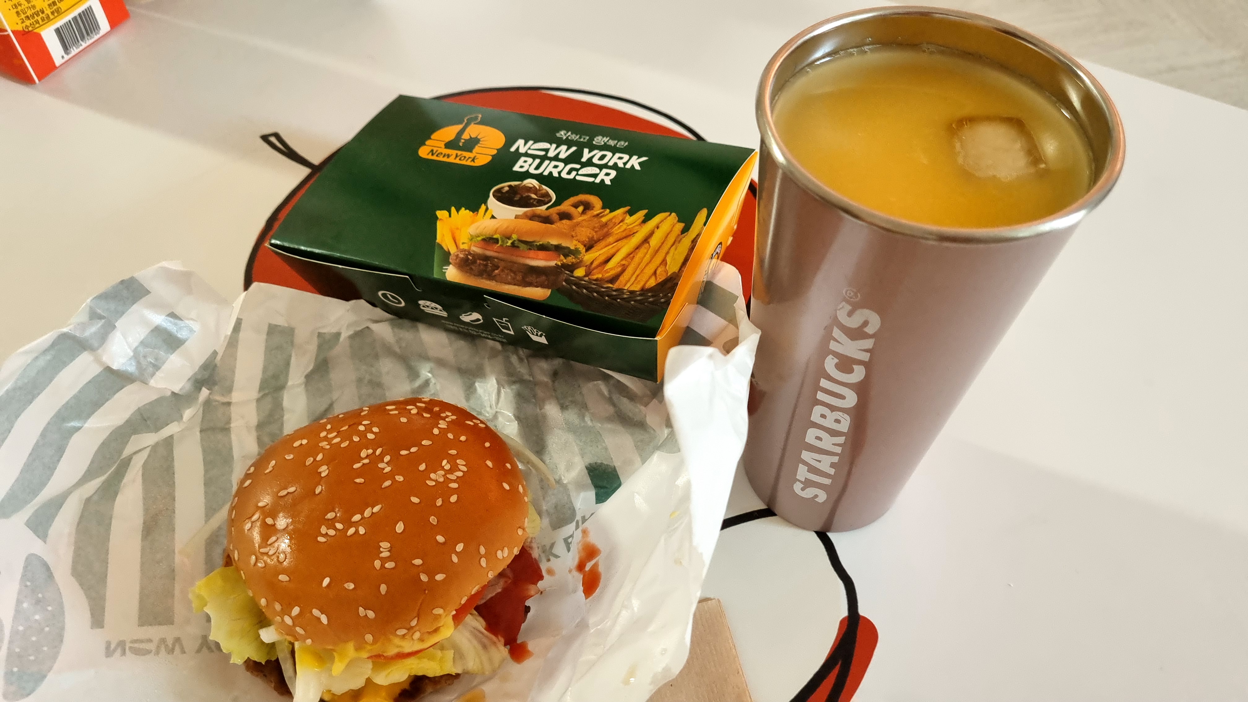 뉴욕버거 단품 + 프라이팩 + 오렌지 쥬스로 시작해봅니다.